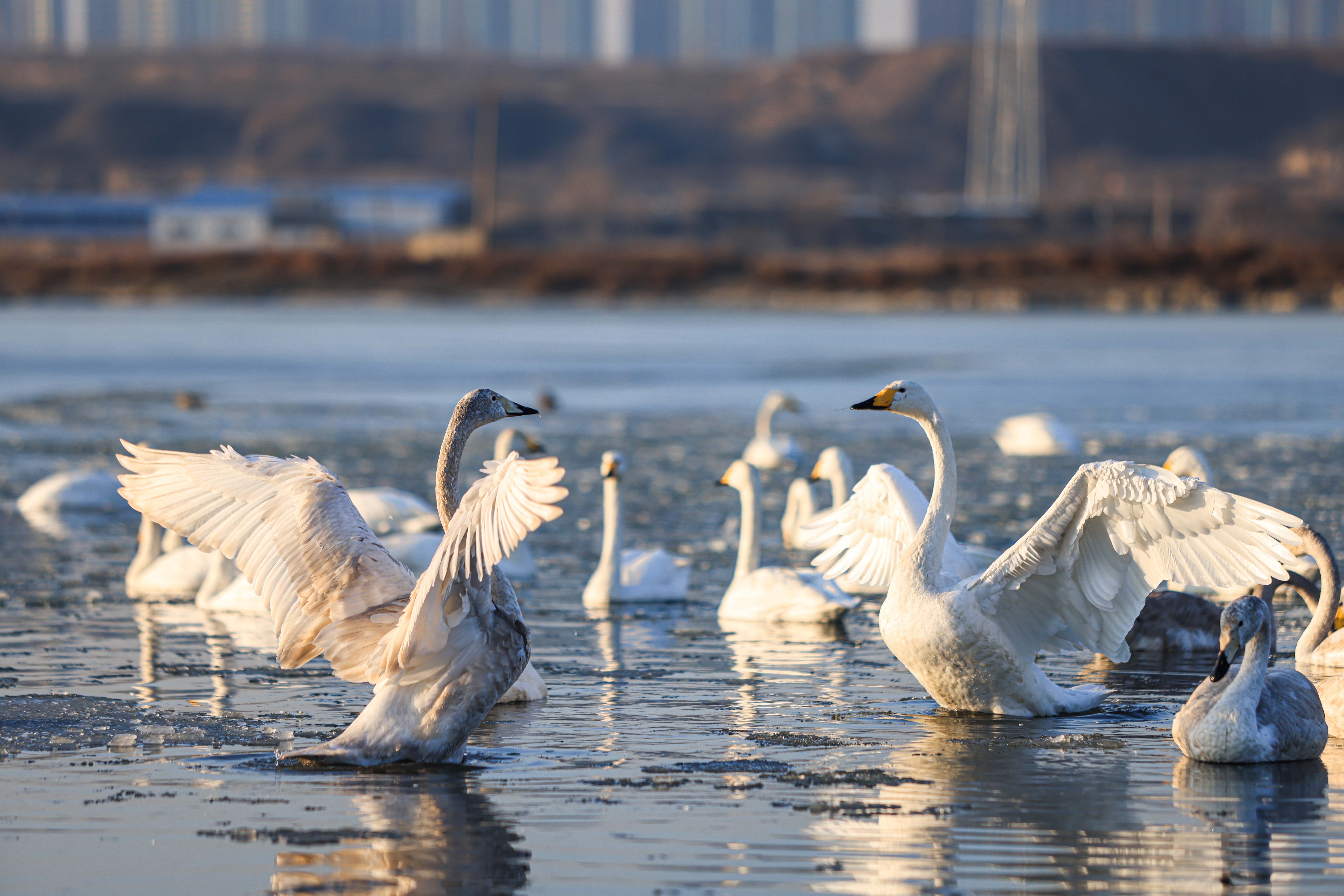 前來越冬的白天鵝或嬉戲、或飛翔、或覓食,成為一道美麗的風景