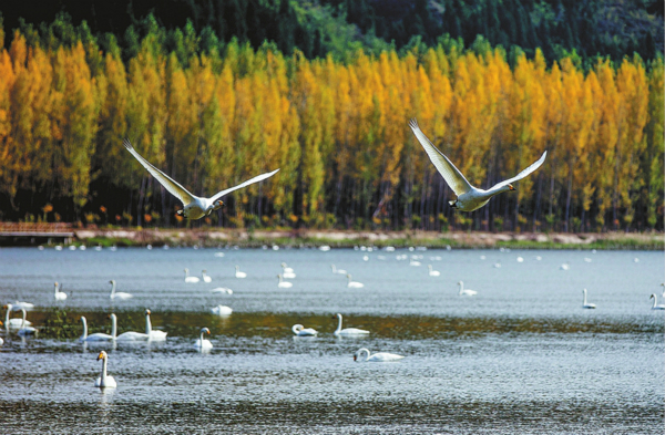 The Yellow River wetland in Pinglu county is now a habitat of migrant birds like swans, thanks to its improved environment. LIU WENLI / FOR CHINA DAILY
