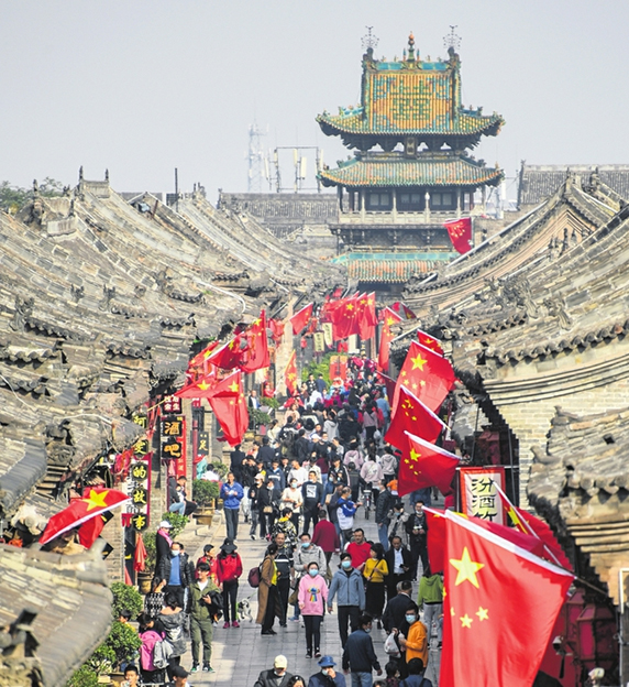 Pingyao, in central Shanxi and one of the top tourist destinations in the province, is known for its ancient city, old streets and time-honored firms established by the famed Shanxi merchants centuries ago. The county of Pingyao welcomed more than 300,000 visits during the eight-day National Day and Mid-Autumn Festival holidays on Oct 1-8. The figure ranks it first among all tourist attractions in Shanxi province. Shanxi province received more than 52 million visits during the period and netted a tourism revenue of 31.64 billion yuan ($4.69 billion), according to the Shanxi Culture and Tourism Department. The department's officials said the figures-almost the same as last year-show that local tourism has recovered from the negative effects of the COVID-19 outbreak that started earlier this year.