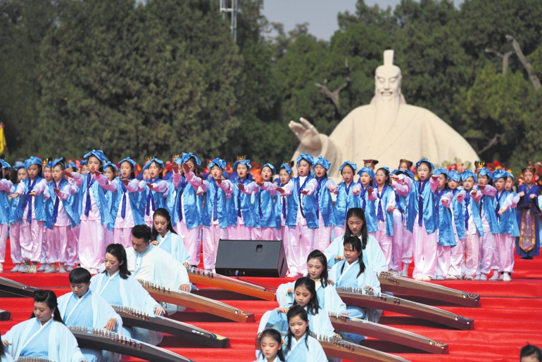Local students play zeng, a stringed musical instrument, during the Shun cultural festival in Yuncheng.