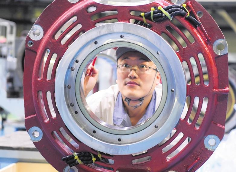 Staff members of CRRC Yongji Electric Motors assemble the permanent magnet traction motors to be used in the new?generation bullet train which has a top speed of 400 kilometers per hour. DAI CHENKAI / FOR CHINA DAILY