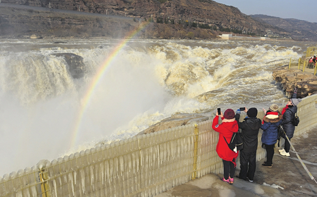 As the temperature fell to below zero in early December,water spray and mist formed icy walls on both banks of the Hukou Waterfall section of the Yellow River,which serves as the boundary of Jixian county in Shanxi province and Yichuan county in Shaanxi province.The charm of the tourist attraction is enhanced by a rainbow appearing in the sunshine and water spray.Hukou Waterfall was formed where the Yellow River flows through Shanxi-Shaanxi Grand Canyon.The width of the Yellow River narrows from more than 400 meters to about 50 meters at this site,making the flow more forceful during its 40-meter drop.