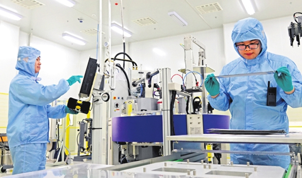 Technicians at a new-energy battery company in Datong check product components inside a lab.