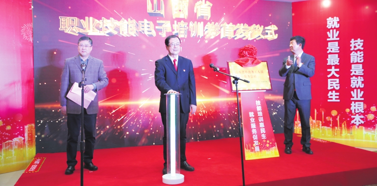 hen Zhenliang (center), chief of the Shanxi Department of Human Resources and Social Security, launches the training coupon issuance ceremony. WANG YANHUI / FOR CHINA DAILY