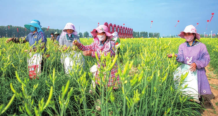 Farmers collect day lily flowers in one of the plantations in Datong. Liu Lujin / For China Daily