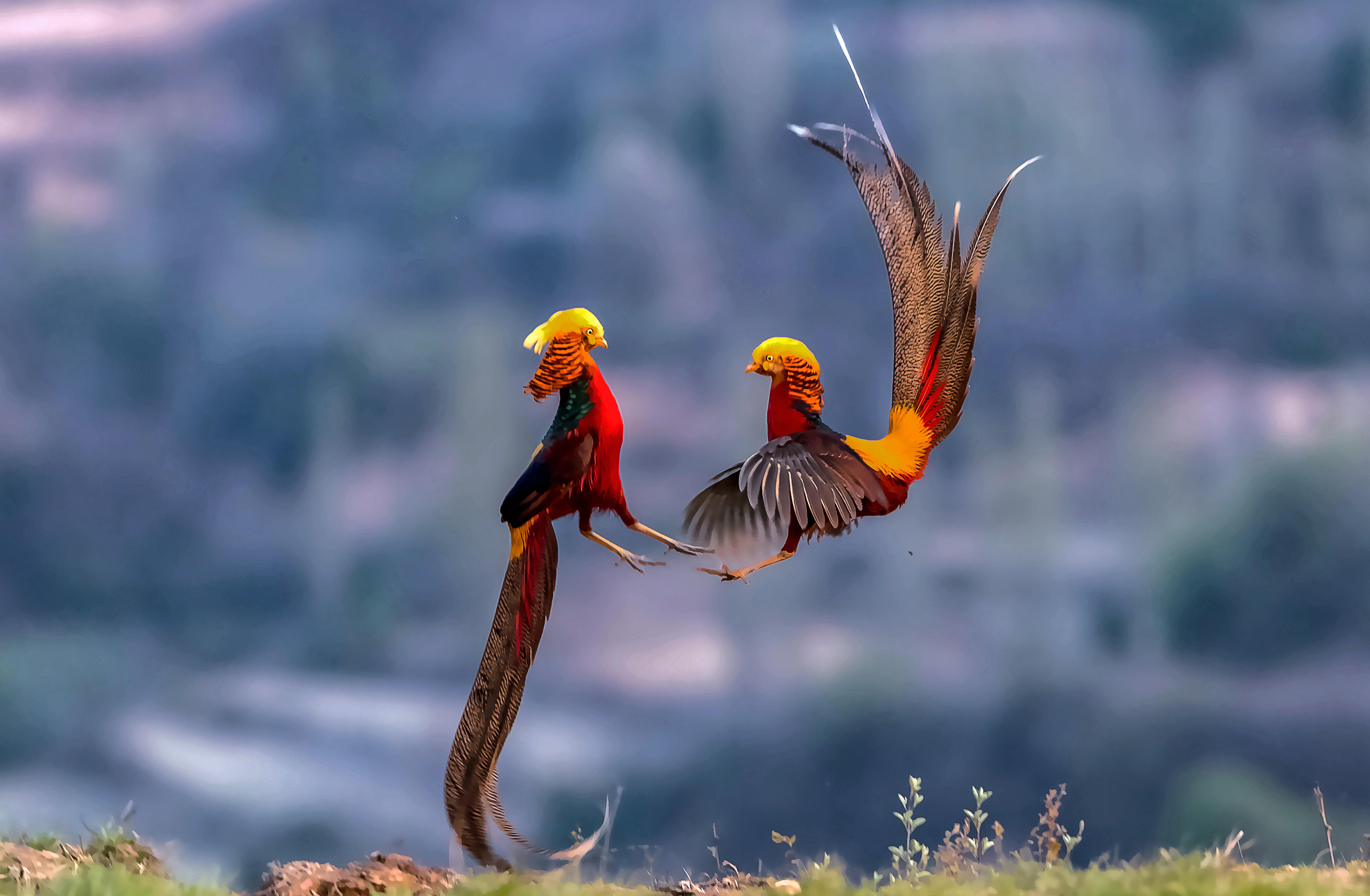 近日,山西省臨汾市翼城縣西閻鎮泉頭村,近百只國家二級保護動物紅腹錦雞迎來求偶期,它們身披七彩華羽在山間自在飛舞。