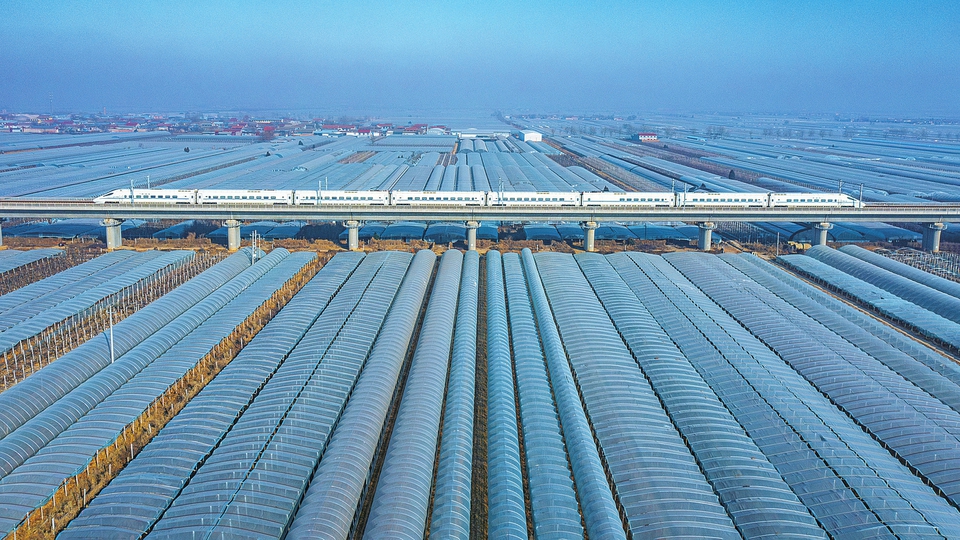 1月2日,臨猗縣廟上鄉廣袤的田野里,設施大棚像“琴鍵”般整齊排列鋪陳大地,與高鐵、公路、村莊構成一幅充滿活力的冬日畫卷。楊建峰 攝