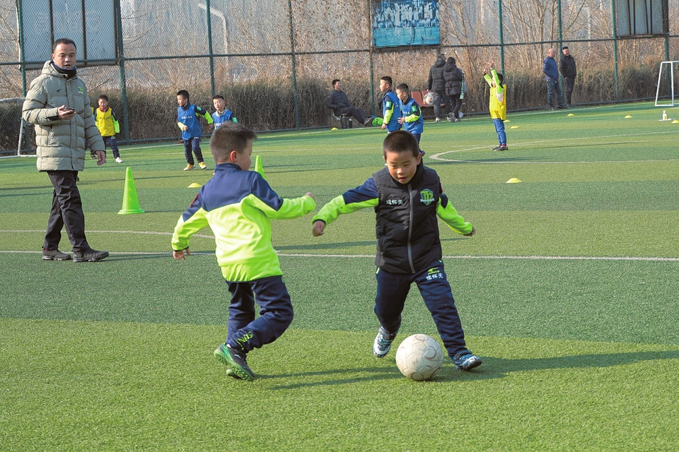 近日,太原市汾河景區足球場上,小朋友在參加訓練。孩子們追逐奔跑、揮灑汗水,在運動中享受美好春光。(申晉光攝)