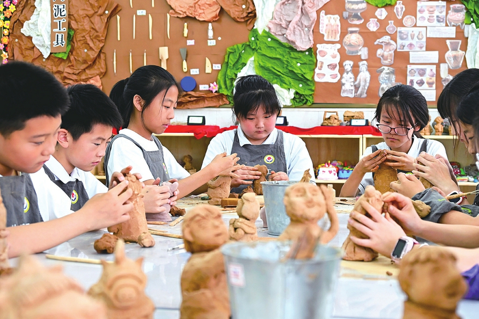 5月12日,垣曲縣七一小學泥塑社團的孩子們正在捏制泥塑作品,從中感受這一傳統藝術的魅力。(崔松良攝)