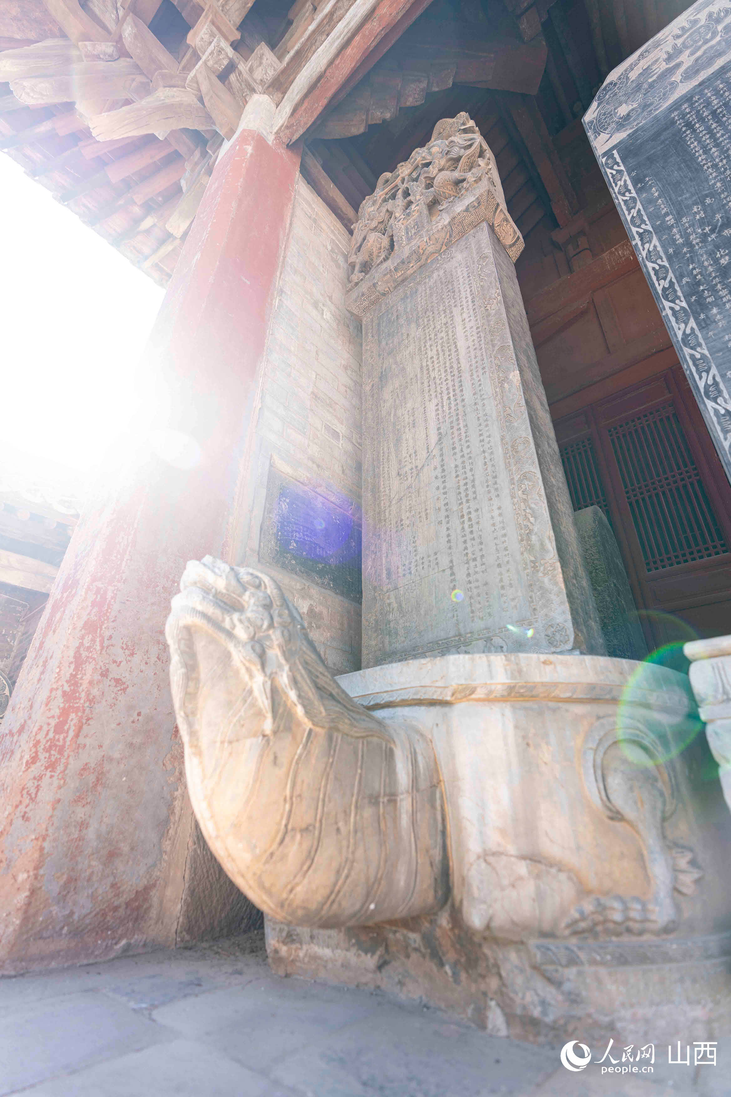 過月臺仰望正殿,前檐方形抹角石柱側腳明顯,據明萬歷二十九年《重修二仙宮碑記》記載:“創自唐昭宗天佑之末年也,其來遠矣”,結合在正殿須彌座神臺發現的金大定十二年題記石碑,可確認其主體建筑為金代遺構。