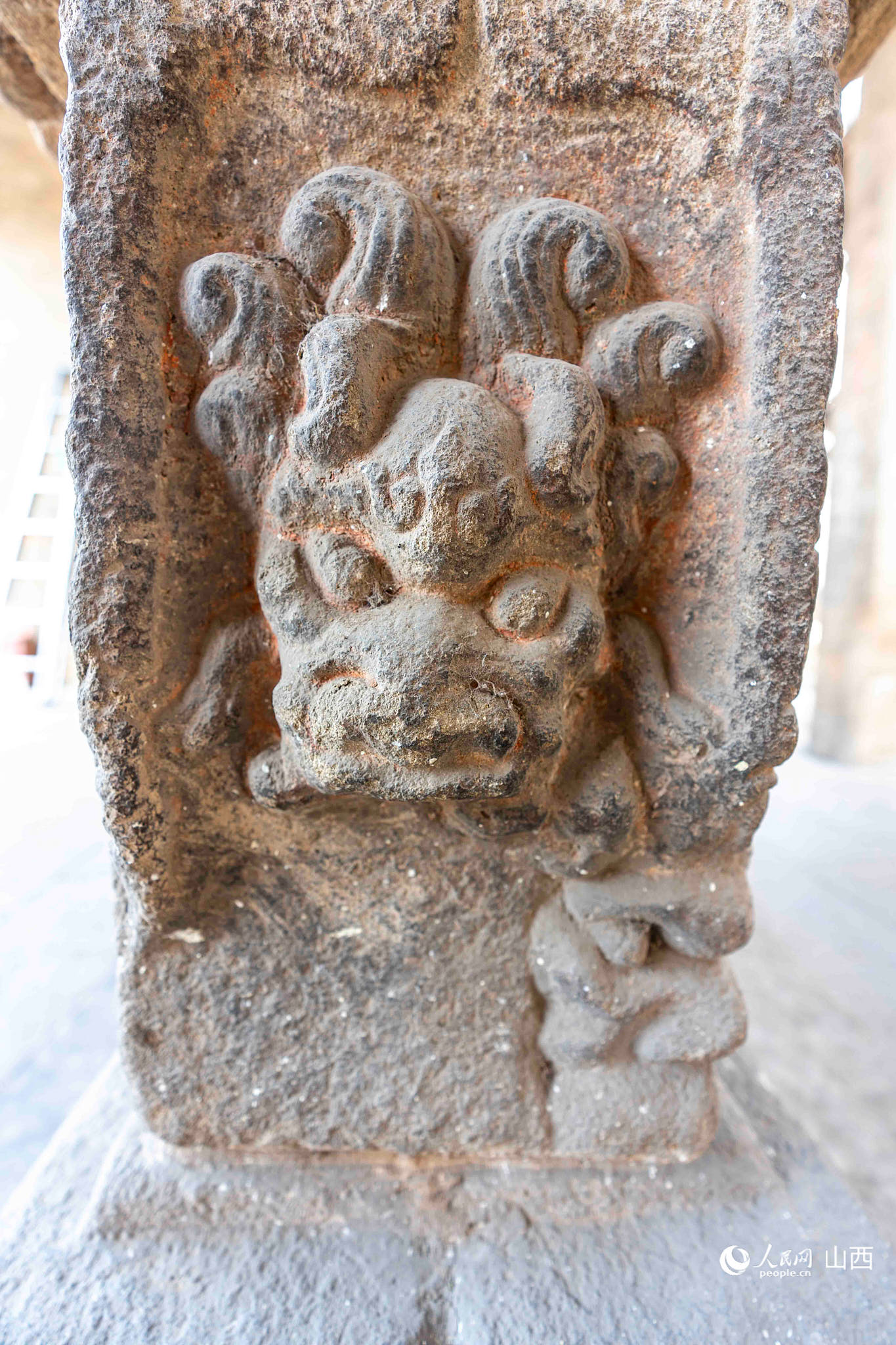 戲臺臺基高1.1米,上下均用條石包砌,呈簡單須彌座樣式。正面臺基束腰石刻有蓮花、牡丹與化生童子的圖案,兩側是石雕力士,中間被歲月磨圓的獅首石雕仍保持著凝望戲臺的姿態,仿佛仍在聆聽八百多年前的鼓樂之聲。