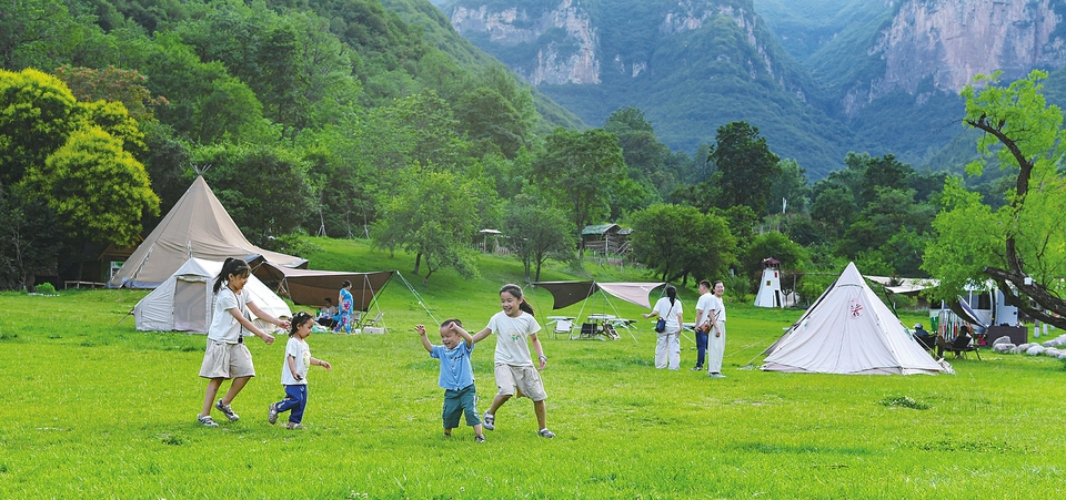 6月21日,小朋友在鄉寧縣云丘山露營地玩耍。入夏以來,云丘山景區以其優美的自然環境,吸引游人來此放松身心,享受愜意生活。(李虎威 攝)