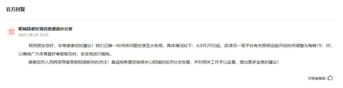 收到留言后,陽城縣委社情民意通道辦公室第一時間對網友建議內容進行了回復:已第一時間將問題反饋至水務局,從8月29日起,獲澤河一級平臺有關照明設施開啟時間調整為每晚19:30,以確保廣大體育愛好者能夠及時、安全地進行鍛煉。