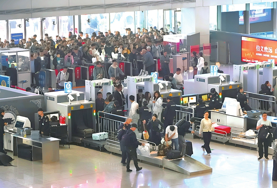 10月4日,太原南站,旅客正有序通過安檢。站內工作人員各司其職,以貼心服務為乘客創造安全有序的環境。(記者 申晉光攝)