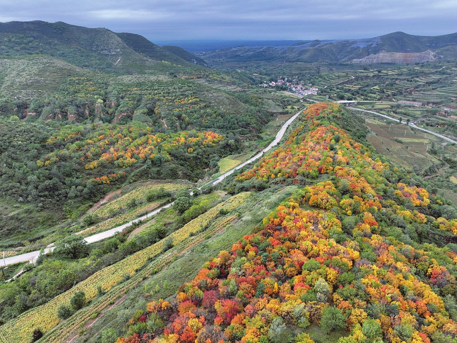 10月8日,航拍鏡頭下,武鄉縣蟠龍鎮安樂莊村附近,蜿蜒的公路與紅、黃、綠交織的山林構成一幅色彩斑斕的深秋畫卷。(李勇 攝)
