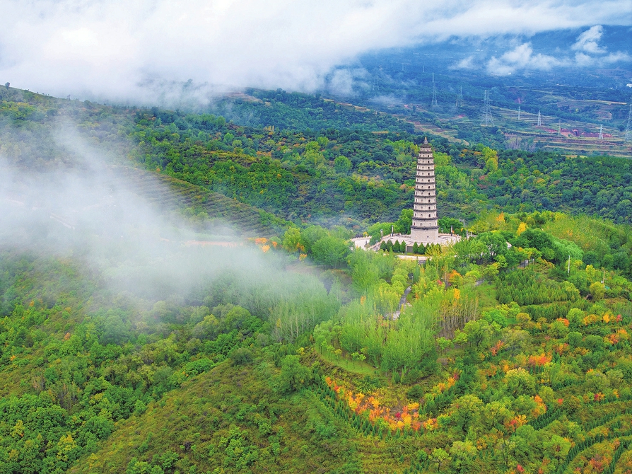 十月六日,左權縣鰲峰公園內,白色薄霧輕飄曼舞,與山上五彩斑斕的秋葉共同構成一幅詩意盎然的天然畫卷。(張文軍 攝)