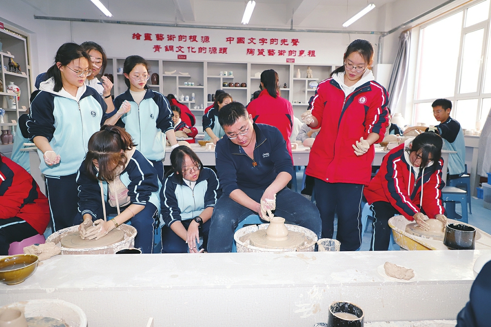 石樓縣石樓中學教師冉建國在給高二年級同學上陶藝課,讓同學們在學習陶藝制作的過程中感受豐富的歷史文化內涵。圖片由石樓縣石樓中學提供